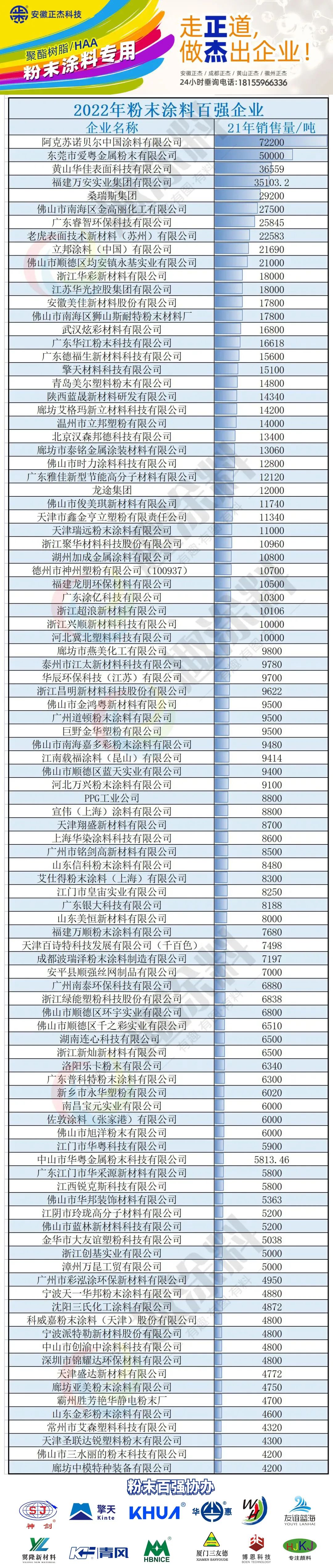 5月23日,由趣涂料(趣涂網(wǎng))主辦,黃山正杰新材料有限公司冠名的“2022年粉末涂料百強企業(yè)”正式揭曉榜單。2021年我國粉末涂料總銷售量為219.81萬噸左右,同比微增3.84%。百強榜單企業(yè)仍然約占全國近半的市場份額,是拉動粉末涂料行業(yè)發(fā)展的“火車頭”。具體來看,“2022年粉末涂料百強企業(yè)”榜單前十名依次分別為:阿克蘇諾貝爾(2021年銷量(下同)72200噸)、愛粵(50000噸)、華佳(36559噸)、萬安(35103.2噸)、桑瑞斯(29200噸)、金高麗(27500噸)、睿智(25845噸)、老虎新材料(22583噸)。