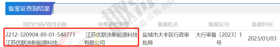 2023年1月3日,江蘇優(yōu)聯(lián)涂新能源科技有限公司,新能源汽車絕緣塑粉生產(chǎn)新建項(xiàng)目,在鹽城市大豐區(qū)行政審批局,進(jìn)行企業(yè)項(xiàng)目備案。