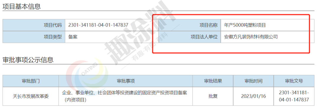 2023年1月16日,安徽方凡裝飾材料有限公司,年產(chǎn)5000噸塑粉項(xiàng)目,在天長(zhǎng)市發(fā)展改革委,進(jìn)行企業(yè)、事業(yè)單位、社會(huì)團(tuán)體等投資建設(shè)的固定資產(chǎn)投資項(xiàng)目備案(內(nèi)資項(xiàng)目)。
