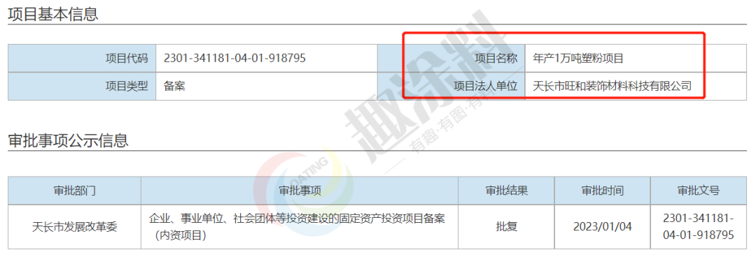 2023年1月4日,天長(zhǎng)市旺和裝飾材料科技有限公司,年產(chǎn)1萬(wàn)噸塑粉項(xiàng)目,在天長(zhǎng)市發(fā)展改革委,進(jìn)行企業(yè)、事業(yè)單位、社會(huì)團(tuán)體等投資建設(shè)的固定資產(chǎn)投資項(xiàng)目備案(內(nèi)資項(xiàng)目)。