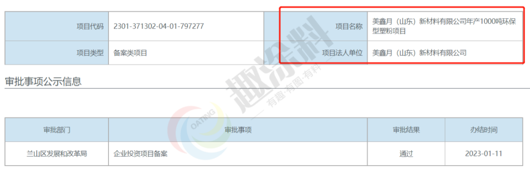 2023年1月11日,美鑫月(山東)新材料有限公司,年產(chǎn)1000噸環(huán)保型塑粉項(xiàng)目,在蘭山區(qū)發(fā)展和改革局,進(jìn)行企業(yè)投資項(xiàng)目備案。