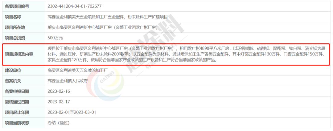 2022年2月17日,高要區(qū)金利鎮(zhèn)美天五金噴涂加工廠,五金配件、粉末涂料生產(chǎn)擴(kuò)建項(xiàng)目,在高要區(qū)金利鎮(zhèn)人民政府,進(jìn)行企業(yè)項(xiàng)目備案。