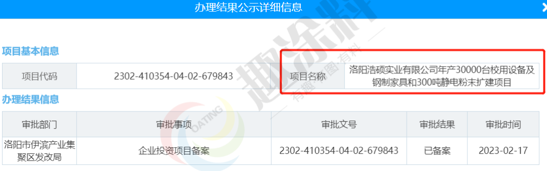 2022年2月17日,洛陽(yáng)浩碩實(shí)業(yè)有限公司,年產(chǎn)30000臺(tái)校用設(shè)備及鋼制家具和300噸靜電粉末擴(kuò)建項(xiàng)目,在洛陽(yáng)市伊濱產(chǎn)業(yè)集聚區(qū)發(fā)改局,進(jìn)行企業(yè)投資項(xiàng)目備案。