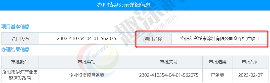2022年2月7日,洛陽(yáng)幻彩粉末涂料有限公司,倉(cāng)庫(kù)擴(kuò)建項(xiàng)目,在洛陽(yáng)市伊濱產(chǎn)業(yè)集聚區(qū)發(fā)改局,進(jìn)行企業(yè)投資項(xiàng)目備案。