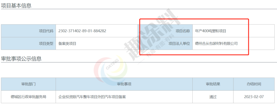 2022年2月7日,德州合從包裝材料有限公司,年產(chǎn)400噸塑粉項(xiàng)目,在德城區(qū)行政審批服務(wù)局,進(jìn)行企業(yè)投資除汽車整車項(xiàng)目外的汽車項(xiàng)目備案。