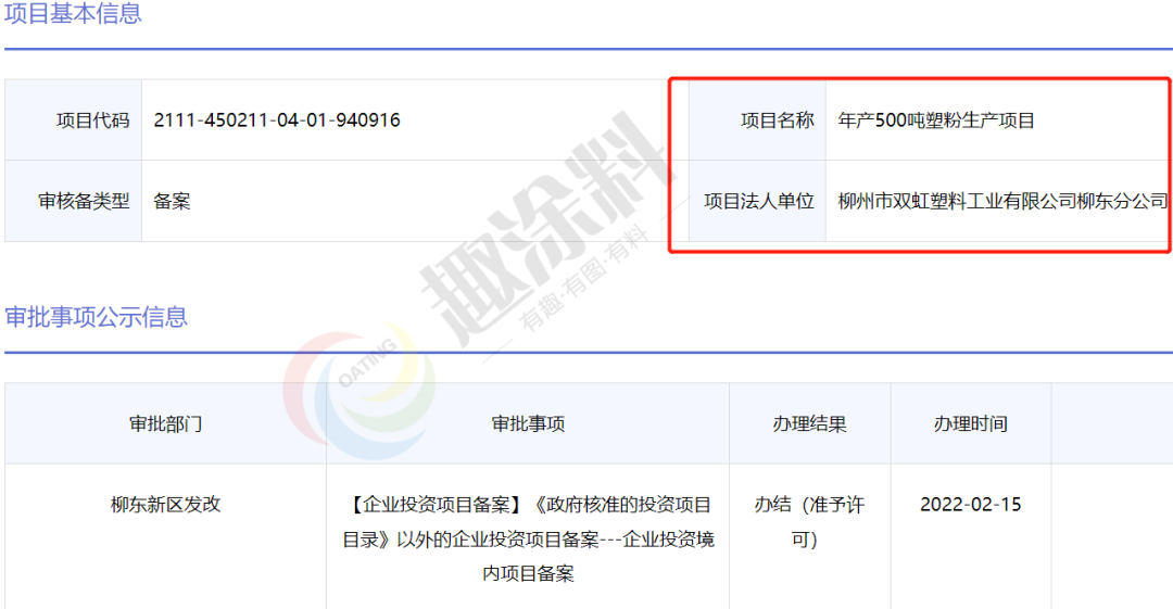 2022年2月15日,柳州市雙虹塑料工業(yè)有限公司柳東分公司,年產(chǎn)500噸塑粉生產(chǎn)項(xiàng)目,在柳東新區(qū)發(fā)改,進(jìn)行企業(yè)投資項(xiàng)目備案。