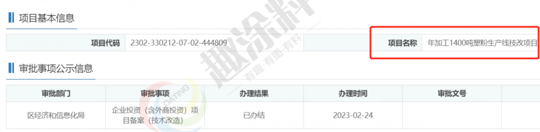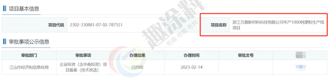 2022年2月14日,浙江萬(wàn)鼎新材料科技有限公司,年產(chǎn)1000噸塑粉生產(chǎn)線項(xiàng)目,在江山市經(jīng)濟(jì)和信息化局,進(jìn)行企業(yè)投資(含外商投資)項(xiàng)目備案(技術(shù)改造)。