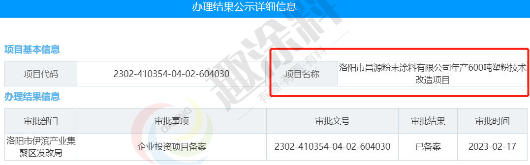 2022年2月17日,洛陽(yáng)市昌源粉末涂料有限公司,年產(chǎn)600噸塑粉技術(shù)改造項(xiàng)目,在洛陽(yáng)市伊濱產(chǎn)業(yè)集聚區(qū)發(fā)改局,進(jìn)行企業(yè)投資項(xiàng)目備案。