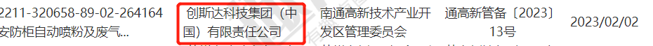 2023年2月2日,創(chuàng)斯達(dá)科技集團(tuán)(中國(guó))有限責(zé)任公司,安防柜自動(dòng)噴粉及廢氣處理系統(tǒng)技術(shù)改造項(xiàng)目,在南通高新技術(shù)產(chǎn)業(yè)開發(fā)區(qū)管理委員會(huì),進(jìn)行企業(yè)項(xiàng)目備案。