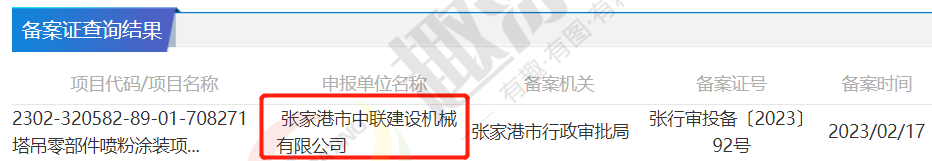 2023年2月17日,張家港市中聯(lián)建設(shè)機(jī)械有限公司,塔吊零部件噴粉涂裝項(xiàng)目,在張家港市行政審批局,進(jìn)行企業(yè)項(xiàng)目備案。