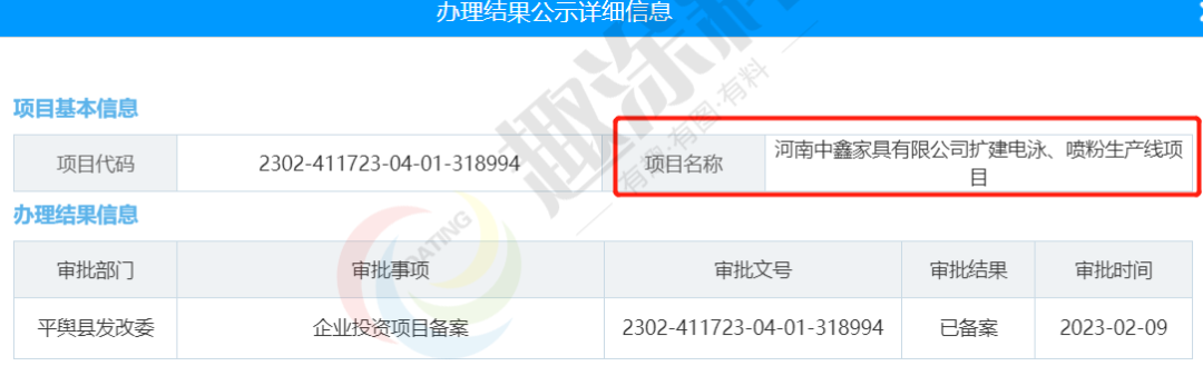 2023年2月9日,河南中鑫家具有限公司,擴(kuò)建電泳、噴粉生產(chǎn)線項(xiàng)目,在平輿縣發(fā)改委,進(jìn)行企業(yè)投資項(xiàng)目備案。