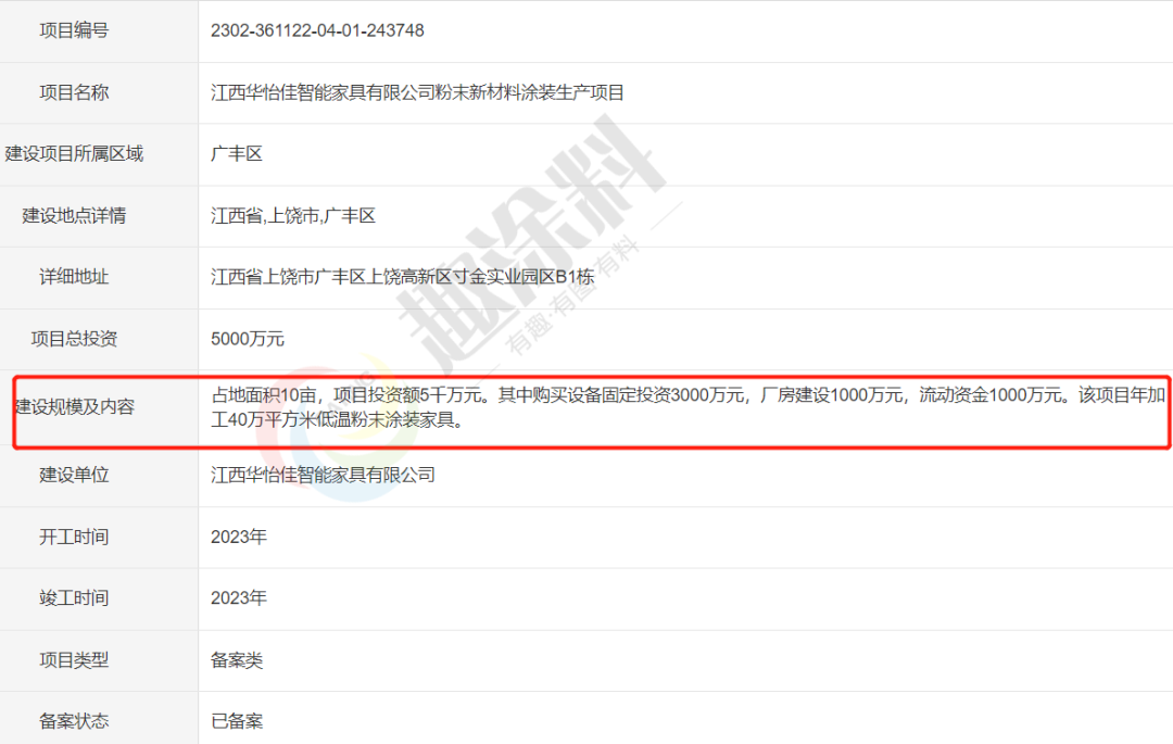 2022年2月24日,江西華怡佳智能家具有限公司,粉末新材料涂裝生產(chǎn)項(xiàng)目,進(jìn)行企業(yè)項(xiàng)目備案。