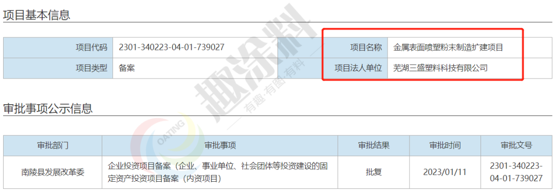 2023年1月11日,蕪湖三盛塑料科技有限公司,金屬表面噴塑粉末制造擴(kuò)建項(xiàng)目,在南陵縣發(fā)展改革委,進(jìn)行企業(yè)投資項(xiàng)目備案(企業(yè)、事業(yè)單位、社會(huì)團(tuán)體等投資建設(shè)的固定資產(chǎn)投資項(xiàng)目備案(內(nèi)資項(xiàng)目)。