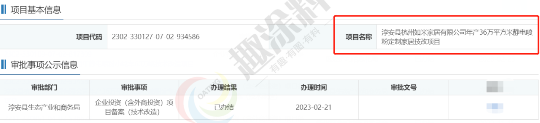 2023年2月21日,淳安縣杭州如米家居有限公司,年產(chǎn)36萬平方米靜電噴粉定制家居技改項(xiàng)目,在淳安縣生態(tài)產(chǎn)業(yè)和商務(wù)局,進(jìn)行企業(yè)投資(含外商投資)項(xiàng)目備案(技術(shù)改造)。