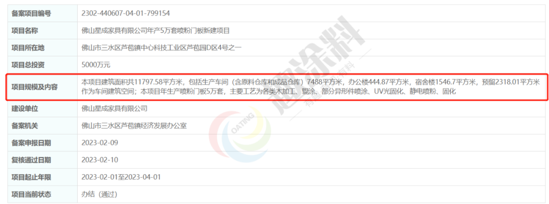 2023年2月10日,佛山星成家具有限公司,年產(chǎn)5萬套噴粉門板新建項(xiàng)目,在佛山市三水區(qū)蘆苞鎮(zhèn)經(jīng)濟(jì)發(fā)展辦公室,進(jìn)行企業(yè)項(xiàng)目備案。