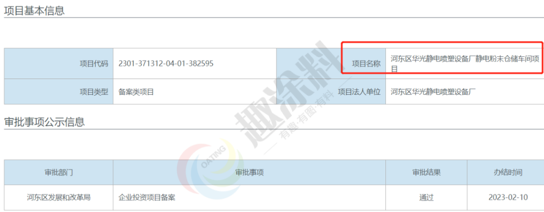 2023年1月6日,河?xùn)|區(qū)華光靜電噴塑設(shè)備廠,靜電粉末倉(cāng)儲(chǔ)車間項(xiàng)目,在河?xùn)|區(qū)發(fā)展和改革局,進(jìn)行企業(yè)投資項(xiàng)目備案。