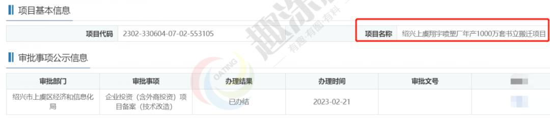 2023年2月21日,紹興上虞翔宇噴塑廠,年產(chǎn)1000萬套書立搬遷項(xiàng)目,在紹興市上虞區(qū)經(jīng)濟(jì)和信息化局,企業(yè)投資(含外商投資)項(xiàng)目備案(技術(shù)改造)。