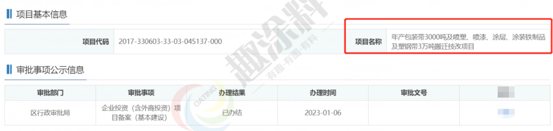 2023年1月10日,興化市亞鑫消防器材有限公司,密閉式水性漆自動(dòng)化噴漆、噴塑生產(chǎn)線及環(huán)保設(shè)施提升技術(shù)改造項(xiàng)目,在興化市行政審批局,進(jìn)行企業(yè)項(xiàng)目備案。