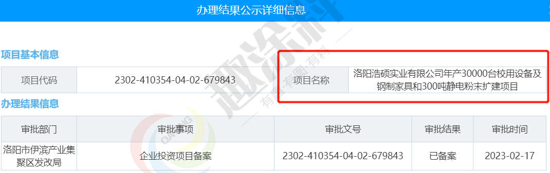 2023年2月17日,洛陽浩碩實(shí)業(yè)有限公司,年產(chǎn)30000臺(tái)校用設(shè)備及鋼制家具和300噸靜電粉末擴(kuò)建項(xiàng)目,在洛陽市伊濱產(chǎn)業(yè)集聚區(qū)發(fā)改局,進(jìn)行企業(yè)投資項(xiàng)目備案。
