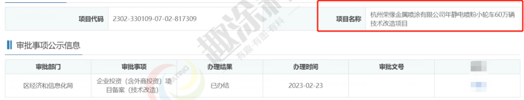 2023年2月23日,杭州榮緣金屬噴涂有限公司,年靜電噴粉小輪車60萬輛技術(shù)改造項(xiàng)目,在區(qū)經(jīng)濟(jì)和信息化局,進(jìn)行企業(yè)投資(含外商投資)項(xiàng)目備案(技術(shù)改造)。