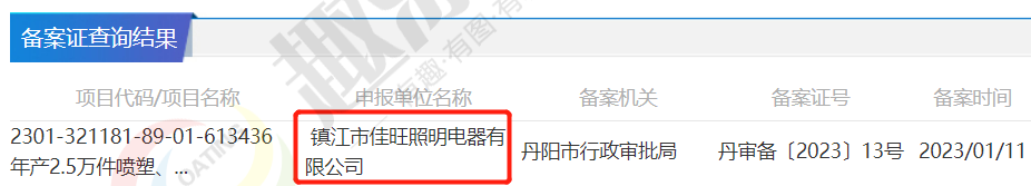 2023年1月11日,鎮(zhèn)江市佳旺照明電器有限公司,年產(chǎn)2.5萬件噴塑、700噸型材生產(chǎn)線建設(shè)項(xiàng)目,在丹陽市行政審批局,進(jìn)行企業(yè)項(xiàng)目備案。