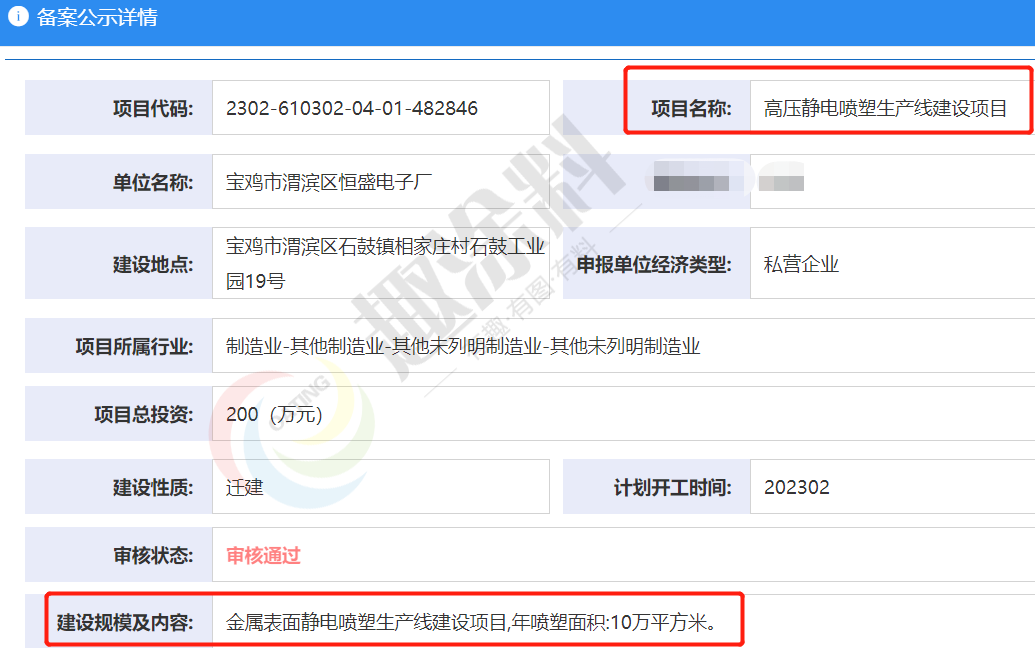 2023年2月13日,寶雞市渭濱區(qū)恒盛電子廠,高壓靜電噴塑生產(chǎn)線建設(shè)項(xiàng)目,進(jìn)行企業(yè)項(xiàng)目備案。