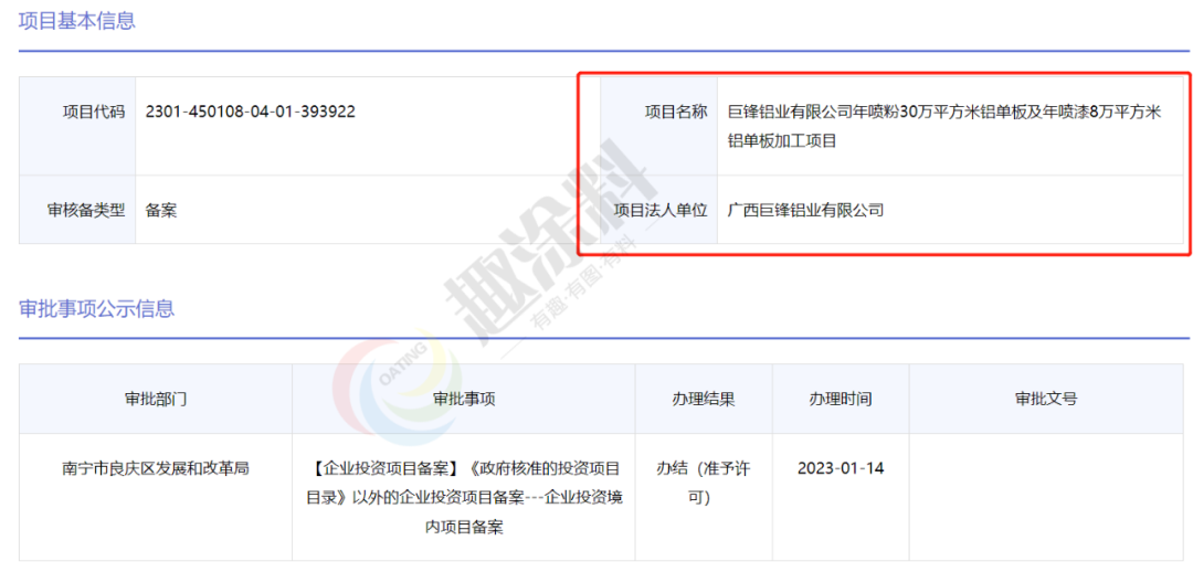 2023年1月14日,廣西巨鋒鋁業(yè)有限公司,年噴粉30萬平方米鋁單板及年噴漆8萬平方米鋁單板加工項(xiàng)目,在南寧市良慶區(qū)發(fā)展和改革局,進(jìn)行企業(yè)投資項(xiàng)目備案。