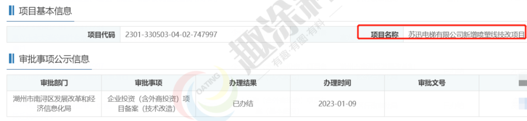 2023年1月9日,蘇迅電梯有限公司,新增噴塑線技改項(xiàng)目,在湖州市南潯區(qū)發(fā)展改革和經(jīng)濟(jì)信息化局,進(jìn)行企業(yè)投資(含外商投資)項(xiàng)目備案(技術(shù)改造)。