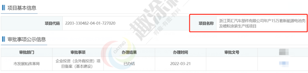 2022年3月21日,浙江英匯汽車部件有限公司,年產(chǎn)15萬套新能源電池殼及噴粉涂裝生產(chǎn)線項(xiàng)目,在市發(fā)展和改革局,進(jìn)行企業(yè)投資(含外商投資)項(xiàng)目備案(基本建設(shè))。