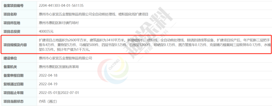 2022年4月19日,惠州市心家宜五金塑膠制品有限公司,全自動前處理線、噴粉固化線擴(kuò)建項(xiàng)目,在惠州市惠陽區(qū)發(fā)展和改革局,進(jìn)行企業(yè)投資項(xiàng)目備案。