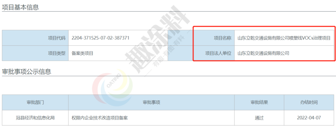 2022年4月2日,山東立乾交通設(shè)施有限公司,噴塑線VOCs治理項(xiàng)目,冠縣經(jīng)濟(jì)和信息化局,進(jìn)行權(quán)限內(nèi)企業(yè)技術(shù)改造項(xiàng)目備案。