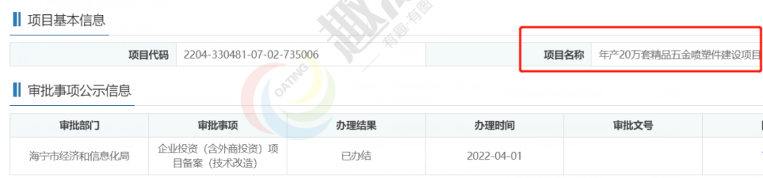 2022年4月1日,海寧市盛鴻五金廠,年產(chǎn)20萬套精品五金噴塑件建設(shè)項(xiàng)目,在海寧市經(jīng)濟(jì)和信息化局,進(jìn)行企業(yè)投資(含外商投資)項(xiàng)目備案(技術(shù)改造)。