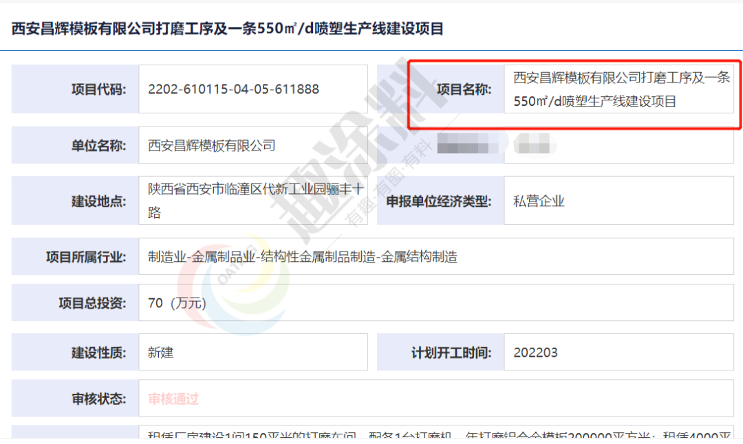 2022年2月28日,西安昌輝模板有限公司,打磨工序及一條550㎡/d噴塑生產(chǎn)線建設(shè)項(xiàng)目,進(jìn)行企業(yè)項(xiàng)目備案。