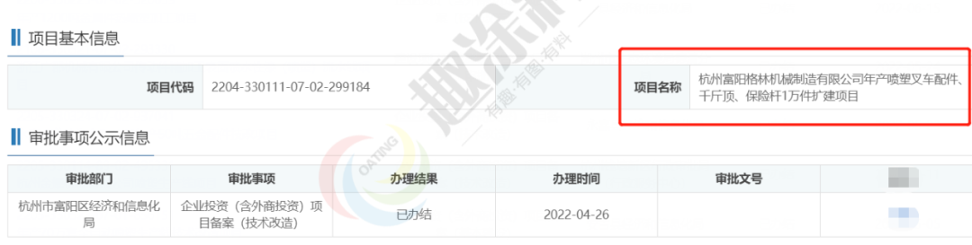2022年4月26日,杭州富陽格林機(jī)械制造有限公司,年產(chǎn)噴塑叉車配件、千斤頂、保險(xiǎn)桿1萬件擴(kuò)建項(xiàng)目,在杭州市富陽區(qū)經(jīng)濟(jì)和信息化局,進(jìn)行企業(yè)投資(含外商投資)項(xiàng)目備案(技術(shù)改造)。