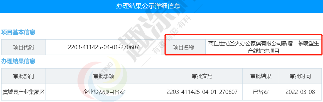 2022年3月8日,商丘世紀(jì)圣火辦公家俱有限公司,新增一條噴塑生產(chǎn)線擴(kuò)建項(xiàng)目,在虞城縣產(chǎn)業(yè)集聚區(qū),進(jìn)行企業(yè)投資項(xiàng)目備案。