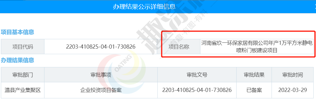 2022年3月29日,河南省玖一環(huán)保家居有限公司,年產(chǎn)1萬平方米靜電噴粉門板建設(shè)項(xiàng)目,在溫縣產(chǎn)業(yè)集聚區(qū),進(jìn)行企業(yè)投資項(xiàng)目備案。