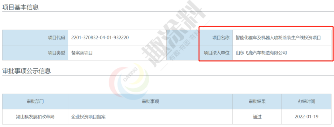 2022年1月19日,山東飛鹿汽車制造有限公司,智能化罐車及機(jī)器人噴粉涂裝生產(chǎn)線投資項(xiàng)目,在梁山縣發(fā)展和改革局,進(jìn)行企業(yè)投資項(xiàng)目備案。