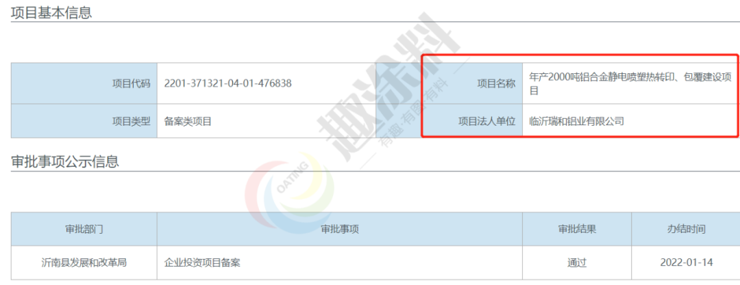 2022年1月14日,臨沂瑞和鋁業(yè)有限公司,年產(chǎn)2000噸鋁合金靜電噴塑熱轉(zhuǎn)印、包覆建設(shè)項(xiàng)目,在沂南縣發(fā)展和改革局,進(jìn)行企業(yè)投資項(xiàng)目備案。