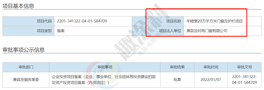 2022年1月7日,蕭縣及時(shí)雨門窗有限公司,年噴塑20萬平方米門窗及護(hù)欄項(xiàng)目,在蕭縣發(fā)展改革委,進(jìn)行企業(yè)投資項(xiàng)目備案。