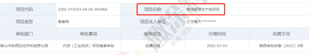 2022年3月3日,遼寧普天數(shù)碼股份有限公司,噴涂噴塑生產(chǎn)線項(xiàng)目,在鞍山市鐵西區(qū)經(jīng)濟(jì)和信息化局,進(jìn)行內(nèi)資(工業(yè)技改)項(xiàng)目備案審批。