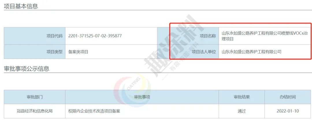 2022年1月10日,山東永如盛公路養(yǎng)護(hù)工程有限公司,噴塑線VOCs治理項(xiàng)目,在冠縣經(jīng)濟(jì)和信息化局,進(jìn)行權(quán)限內(nèi)企業(yè)技術(shù)改造項(xiàng)目備案。