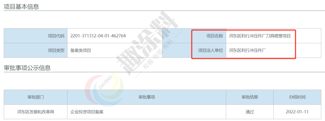 2022年1月11日,河?xùn)|區(qū)利行沖壓件廠,刀具噴塑項(xiàng)目,在河?xùn)|區(qū)發(fā)展和改革局,進(jìn)行企業(yè)投資項(xiàng)目備案。