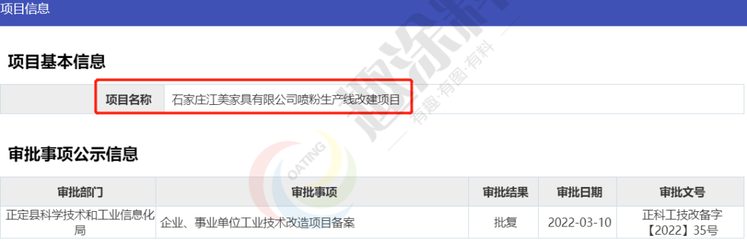 2022年3月10日,石家莊江美家具有限公司,噴粉生產(chǎn)線改建項(xiàng)目,在正定縣科學(xué)技術(shù)和工業(yè)信息化局,進(jìn)行企業(yè)、事業(yè)單位工業(yè)技術(shù)改造項(xiàng)目備案。