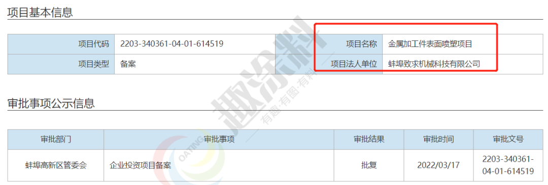 2022年3月17日,蚌埠致求機(jī)械科技有限公司,金屬加工件表面噴塑項(xiàng)目,在蚌埠高新區(qū)管委會,進(jìn)行企業(yè)投資項(xiàng)目備案。