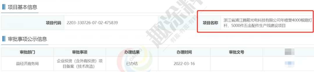 2022年3月16日,浙江省浦江騰箭光電科技有限公司,年噴塑4000根路燈桿、5000件五金配件生產(chǎn)線建設(shè)項(xiàng)目,在縣經(jīng)濟(jì)商務(wù)局,進(jìn)行企業(yè)投資(含外商投資)項(xiàng)目備案(技術(shù)改造)。