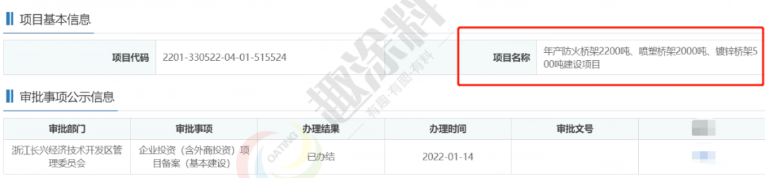 2022年1月14日,湖州恒奧成套電氣設(shè)備有限公司,年產(chǎn)防火橋架2200噸、噴塑橋架2000噸、鍍鋅橋架500噸建設(shè)項(xiàng)目,在浙江長興經(jīng)濟(jì)技術(shù)開發(fā)區(qū)管理委員會,進(jìn)行企業(yè)投資(含外商投資)項(xiàng)目備案(基本建設(shè))。