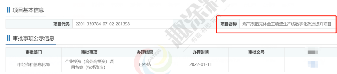 2022年1月11日,浙江朗盛散熱器股份有限公司,燃?xì)獗礓X殼體金工噴塑生產(chǎn)線數(shù)字化改造提升項(xiàng)目,在市經(jīng)濟(jì)和信息化局,進(jìn)行企業(yè)投資(含外商投資)項(xiàng)目備案(技術(shù)改造)。