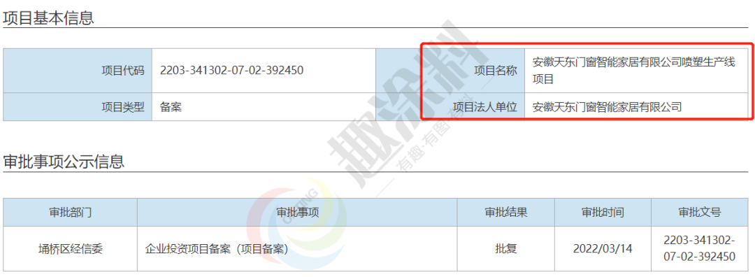 2022年3月14日,安徽天東門窗智能家居有限公司,噴塑生產(chǎn)線項(xiàng)目,在埇橋區(qū)經(jīng)信委,進(jìn)行企業(yè)投資項(xiàng)目備案。