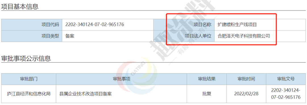 2022年2月28日,合肥澤天電子科技有限公司,擴(kuò)建噴粉生產(chǎn)線項(xiàng)目,在廬江縣經(jīng)濟(jì)和信息化局,進(jìn)行縣屬企業(yè)技術(shù)改造項(xiàng)目備案。