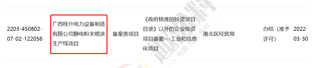 2022年3月30日,廣西桂升電力設(shè)備制造有限公司,電粉末噴涂生產(chǎn)線項(xiàng)目,在港北區(qū)經(jīng)貿(mào)局,進(jìn)行企業(yè)投資項(xiàng)目備案。